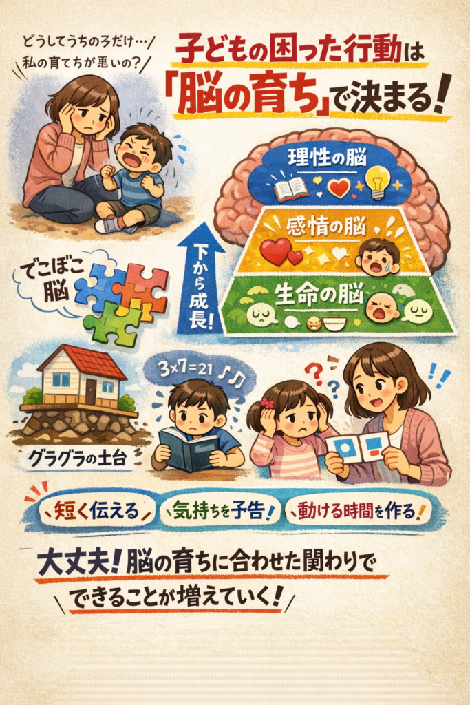 子どもの困った行動は性格ややる気ではなく「脳の発達段階」が原因かもしれません。しつけ不足と自分を責めていませんか?脳の仕組みを理解すれば、イライラが安心に変わり、特性に合わせた具体的な接し方が見えてきます。発達に悩む親御さんの心がフッと軽くなる、脳科学の視点をお届けします