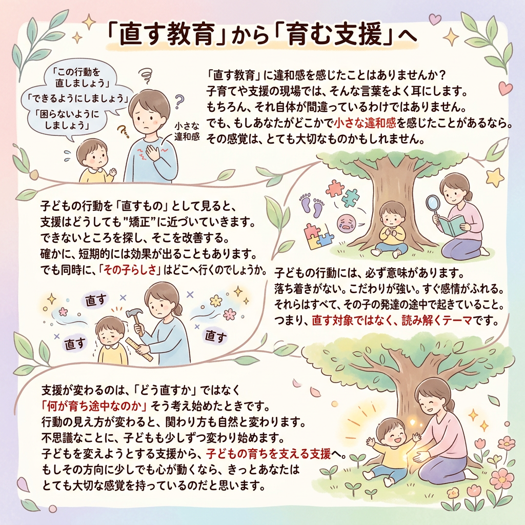 発達障害のある子どもの支援方法に悩んでいませんか?「直す」アプローチに限界を感じたとき、視点を変えるだけで関わり方が変わります。行動の意味を読み解く支援の考え方を、保護者・支援職向けにわかりやすく解説します。