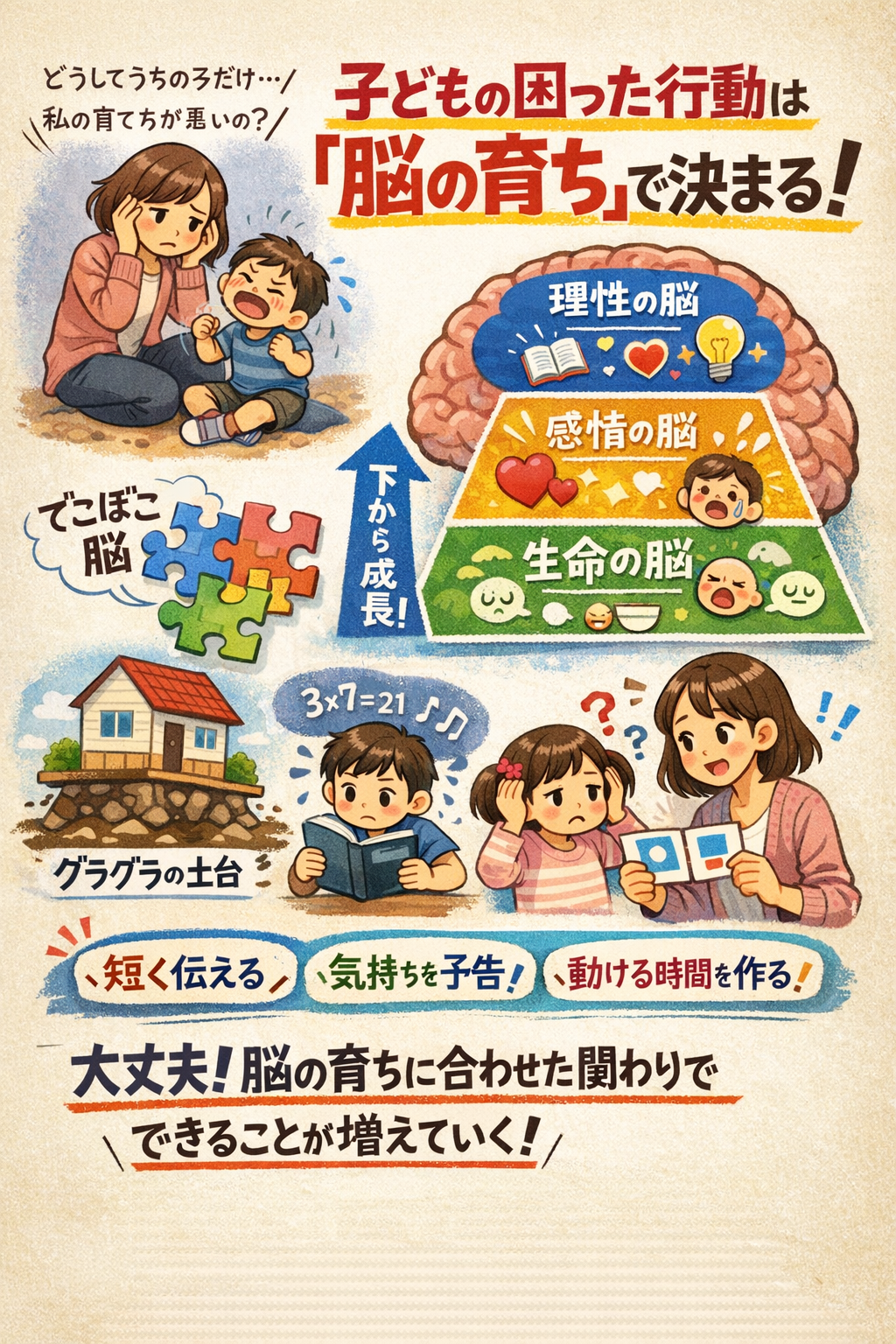 発達に悩みがある場合、この「3. 理性の脳」がまだ十分に機能していないことがあります。